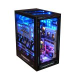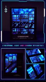 Tech-Infused Design: Immerse yourself in the cyberpunk universe with a book nook that features a striking fusion of technology-inspired elements. Technology blue is the main tone. contrasting with yellow and pink light.