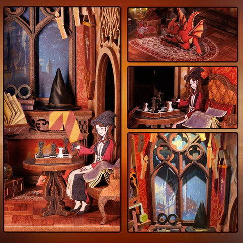 Step into the enchanting Flame Common Room Book Nook. where the flames of a blazing fire surge with boundless. restless vitality within the golden chalice. This world of warmth. mystery. and honor awaits. adorned with a wise owl and iconic witch hats as captivating details.