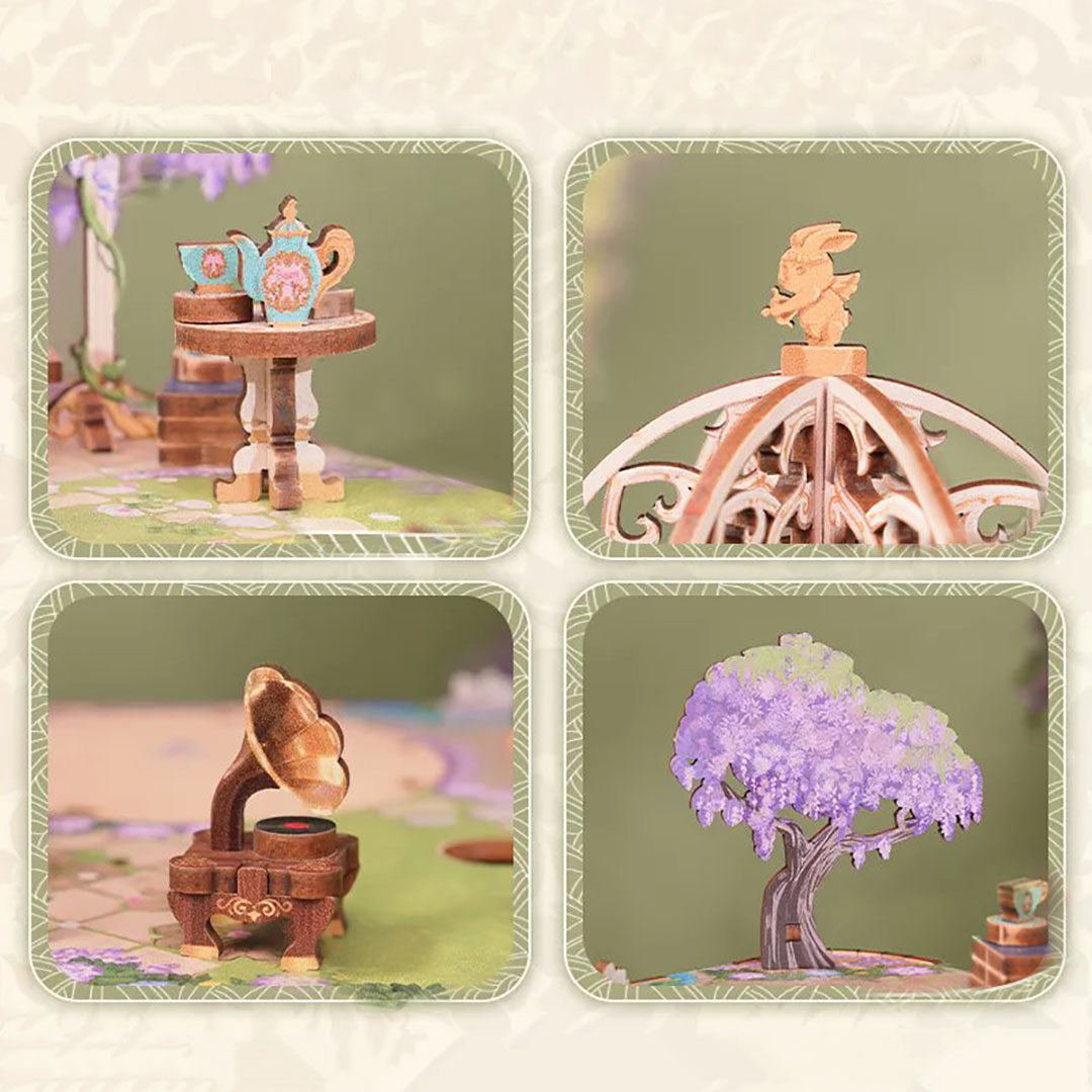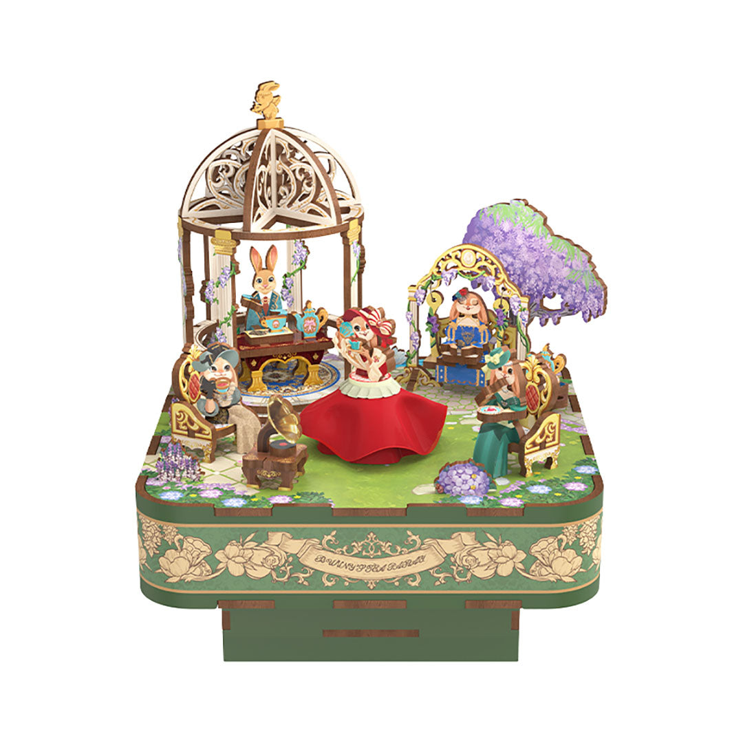 Each little rabbit showcases their unique personality through their attire. emulating the royal fashion of the Victorian era. adding a classical charm to the tea party. Miss Rabbit twirls in the waltz while another rabbit sways on the magical swing to the rhythm of the music.