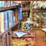 On the left side of the room. you could see an old bookshelf filled with neatly arranged books. with phonographs. vases and other small objects on the corners of the shelves.