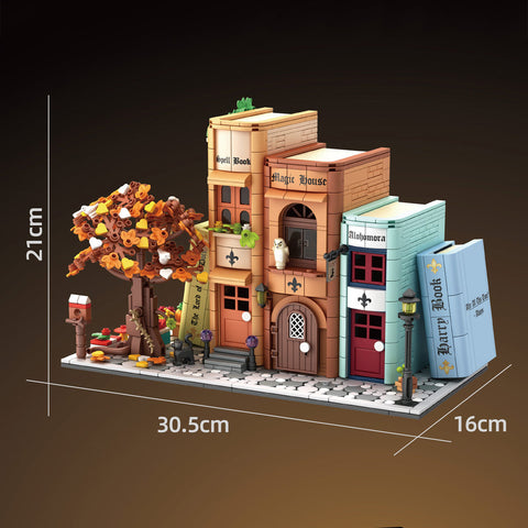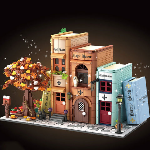 The magic bookends building is composed of five books. autumn trees on the street. heart-shaped leaves. retro street lamps and mailboxes. doors that can be opened. and small Christmas boxes.