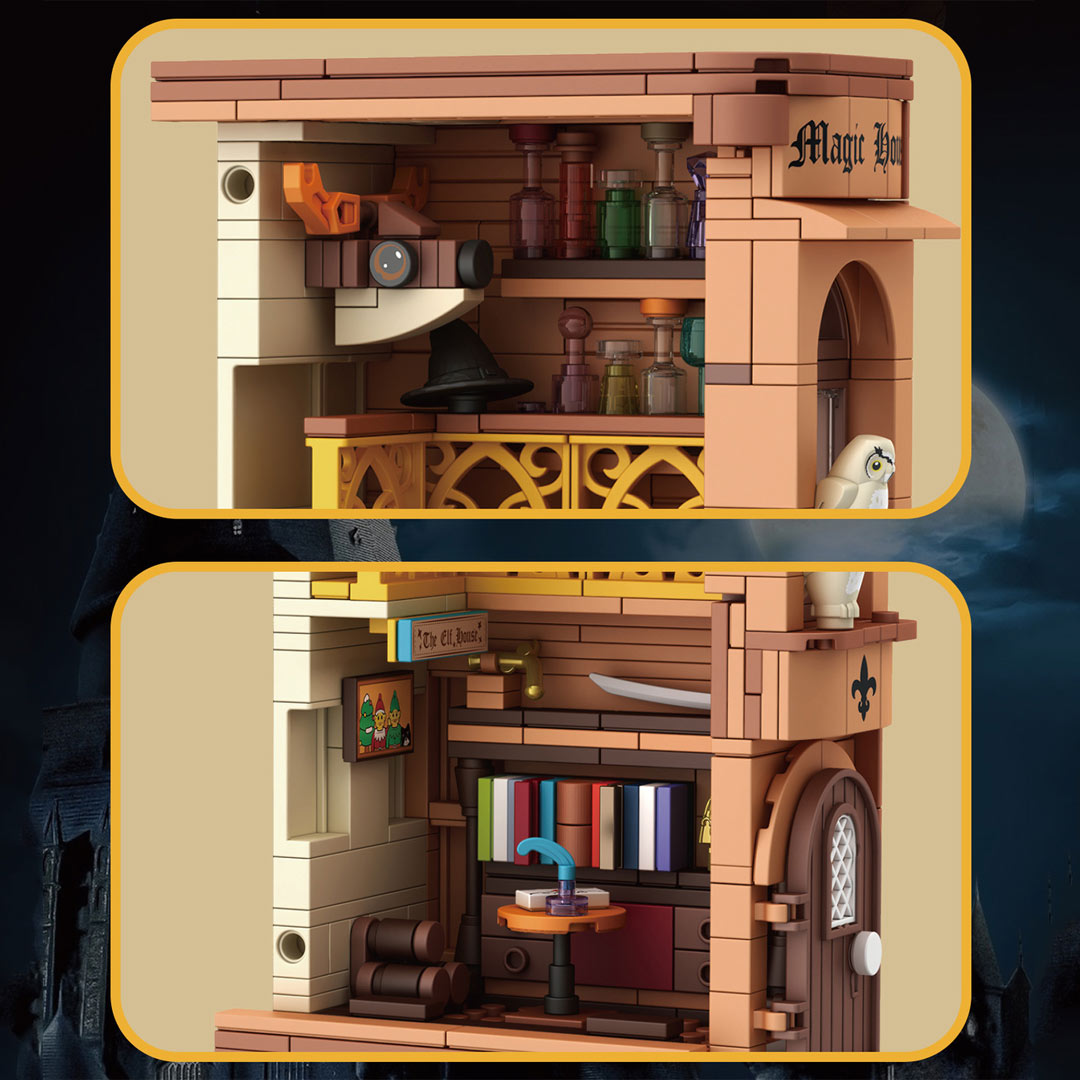 The interior is designed to restore the home of magicians and elves. including magic potions. magic books. envelopes. ancient clocks. deer heads. fireplaces. etc. Many magical elements.