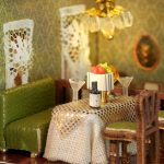 The interior design is centered around retro brown and vintage green wallpaper as the main color scheme. with the lower level primarily featuring bar counter booths.