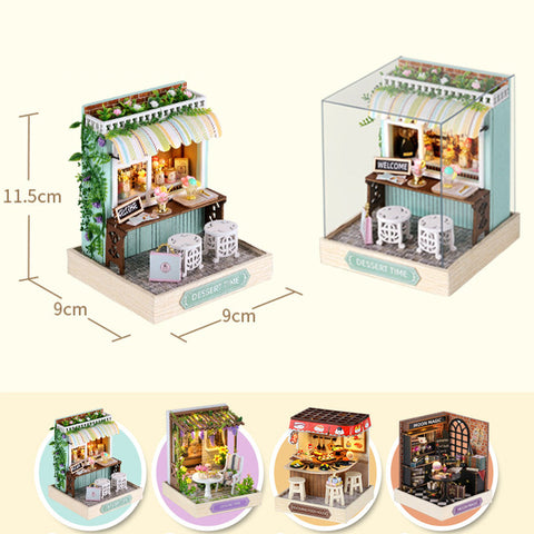 DIY toy house kit material: safety material such as wood. paper. plastic. and cloth. toy house divide into several material packages. pasted from paper to objects. sewn. glued. and assembled. all functions are handmade is needed.