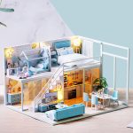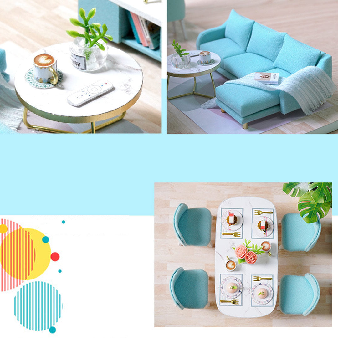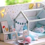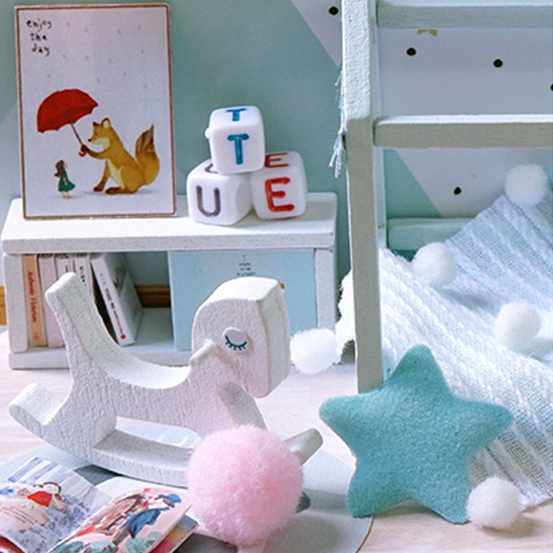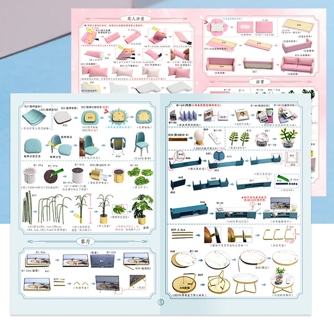 DIY toy house kit material: safety materials such as wood. paper. plastic. and cloth. The toy house is divided into several material packages. pasted from paper to objects. sewn. glued. and assembled. all functions are handmade.