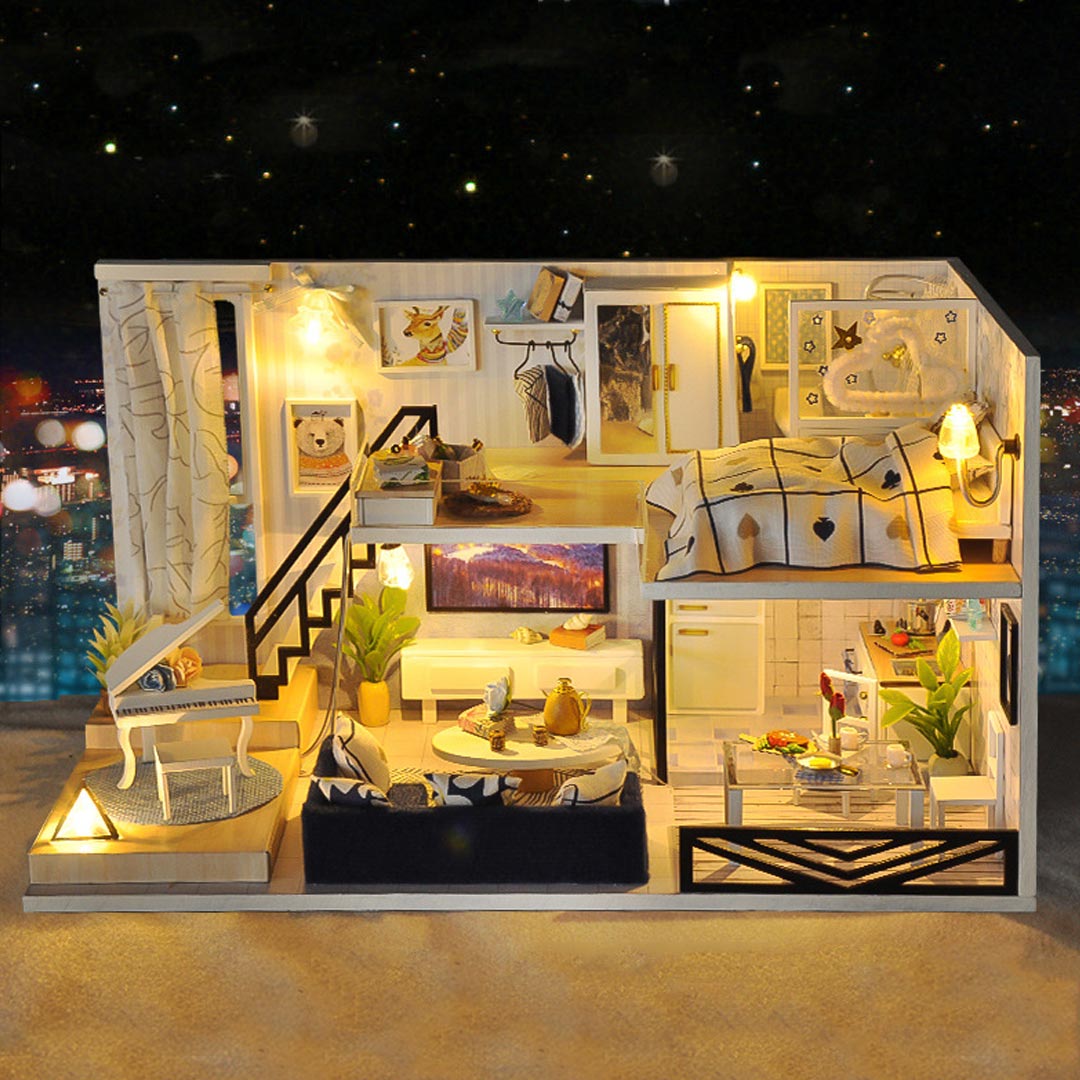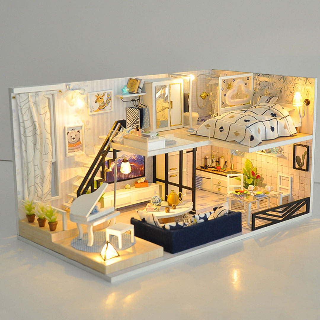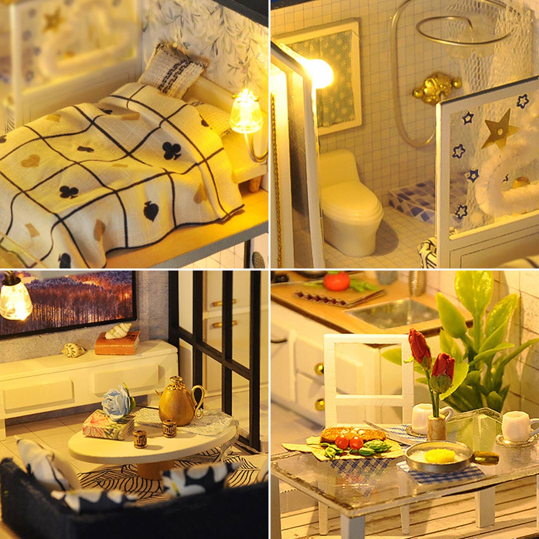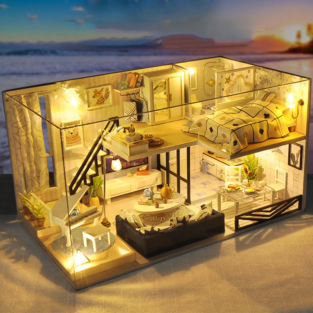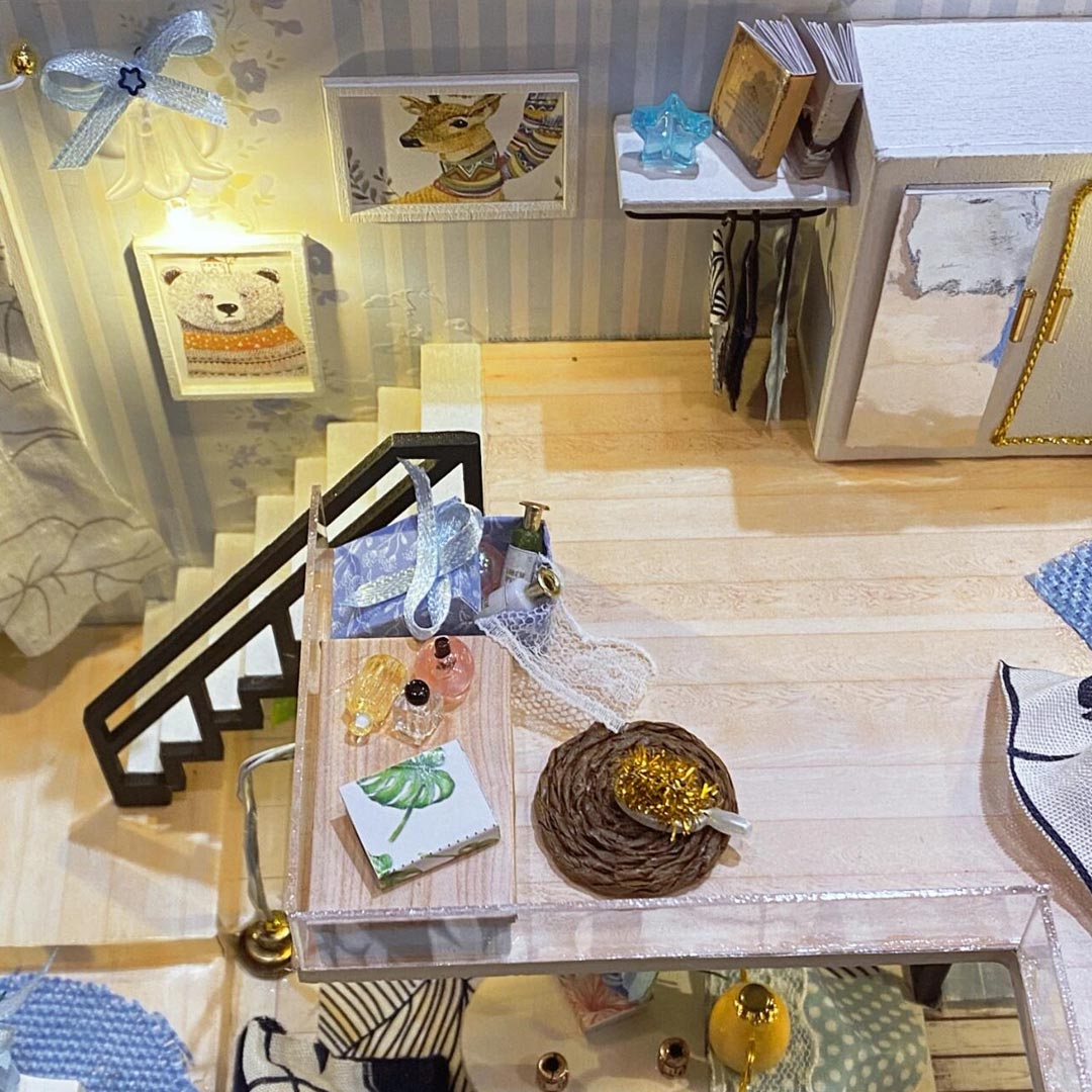 Immerse yourself in the cozy Loft DIY Miniature Dollhouse Kit. With soft lighting casting a gentle glow. open the window to feel the soothing sea breeze. and begin your journey of creating a beautiful life from the comfort of your own miniature home.