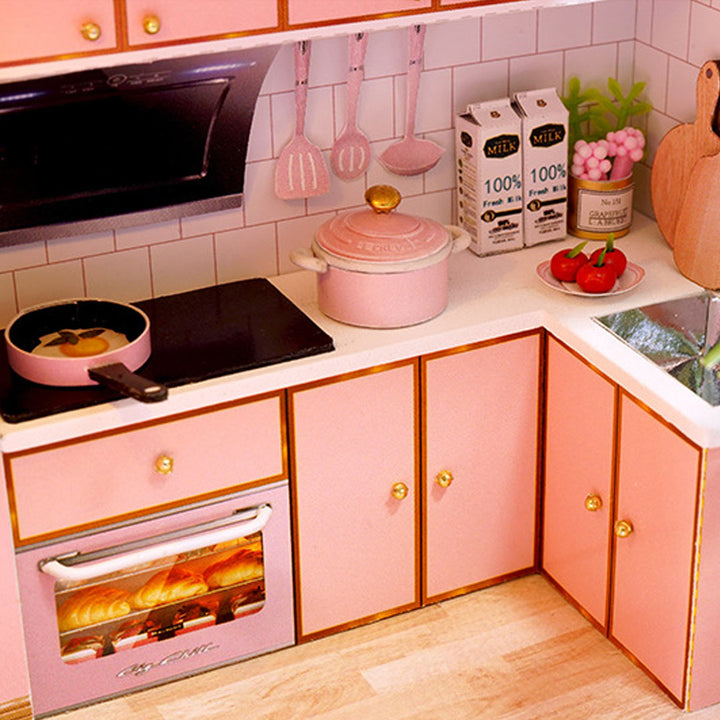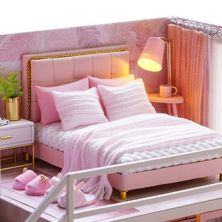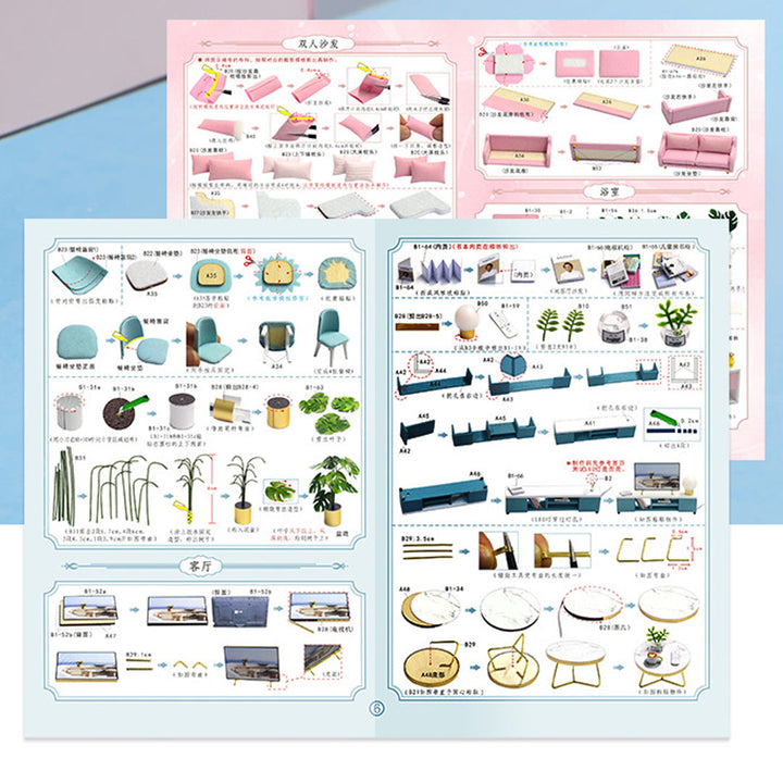 DIY toy house kit material: safety materials such as wood. paper. plastic. and cloth. The toy house is divided into several material packages. pasted from paper to objects. sewn. glued. and assembled. all functions are handmade.